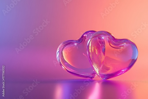 Two interlocking glass hearts illuminated by pink and purple lighting, symbolizing love and romance.