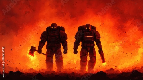 Two intimidating heavily armored sci fi warriors wielding advanced weaponry stand amidst an intense fiery explosion conveying a sense of power danger and an apocalyptic futuristic atmosphere