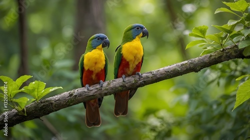bird, pair, perched, tree branch, yellow, green, plumage, timberland, sunlight, leaf, peaceful, tropical, fauna, birdlife, avian, nature, vivid colors, forest, serene, birding, bright, vibrant, ecosystem, rainforest, lush, exotic, tranquil, jungle, lush green, wild bird
