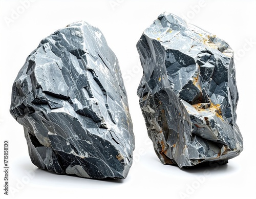 Two irregularly shaped, dark grey, rough-textured stones with visible crystalline structure, isolated on a white background