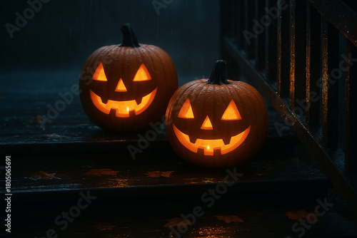 Two Jack-O'-Lanterns Welcoming Guests on a Wet Porch