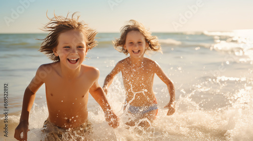 Two joyful children running through the waves on a sunny beach, capturing the essence of a fun-filled summer day by the sea.