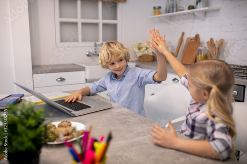 children, children, cute, blond, childhood, indoor, caucasian, loft, apartment, interior, family, brother, sister, kitchen, white, laptop, long-haired, pretty, daytime, studying, high five, friends