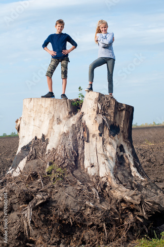 Two kids staying on huge grey dry stump in the middle of field under blue sky