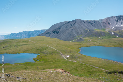 Two lakes, sunlit green meadow, alpine valley and mountain range. Blue sky gradient reflected in water. Top view from rocks to dirt road between two beautiful lakes in high mountains in sunny day.