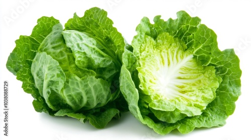 Two Lettuce Heads One Cut in Half Isolated on a White Background Fresh and Green. Generative AI