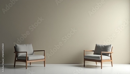 Two light gray upholstered armchairs with light brown wooden frames in a minimalist interior design.