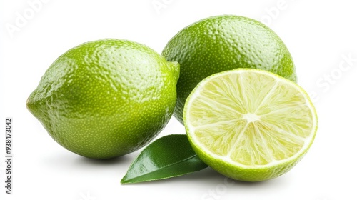 Two limes with one cut in half, showing the inside, with green leaves, isolated on white background.