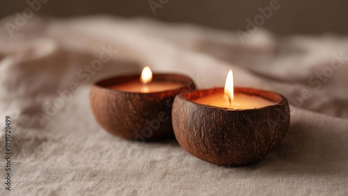 Two lit candles in coconut-shell holders resting on a beige fabric surface. Concept Candlelight, Coconut-shell holders, Beige fabric surface, Cozy rustic decor, Warm ambient lighting