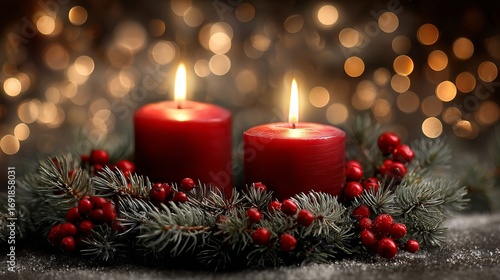 Two lit candles in evergreen wreath with red berries — warm candlelight Christmas centerpiece on golden bokeh background, cozy winter holiday home decor