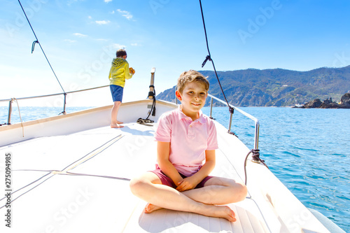 Two little kid boys, best friends enjoying sailing boat trip. Family vacations on ocean or sea on sunny day. Children smiling. Brothers, schoolchilden, siblings, best friends having fun on yacht.