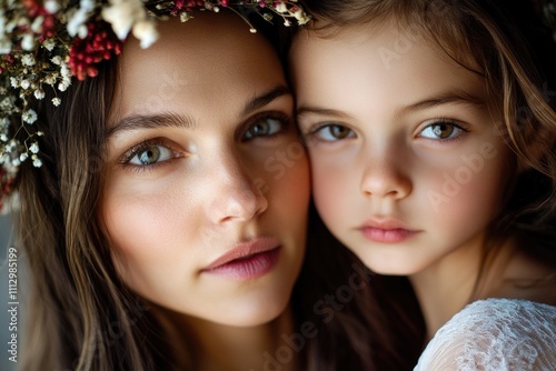 Two lovely girls adorn themselves with flowers, a symbol of beauty and innocence
