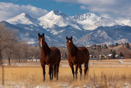 Two majestic horses stand serenely in a golden field, framed by snow-capped mountains on a crisp winter day.