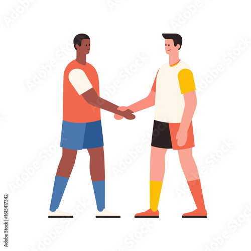 Two male soccer players shaking hands in a gesture of sportsmanship.
