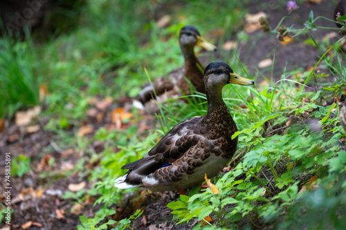 Two mallard female in the thickless on the swamp. Mallard or wild duck (Anas platyrhynchos) is duck that breeds throughout Americas, Eurasia, and North Africa. Most common and famous wild duck.
