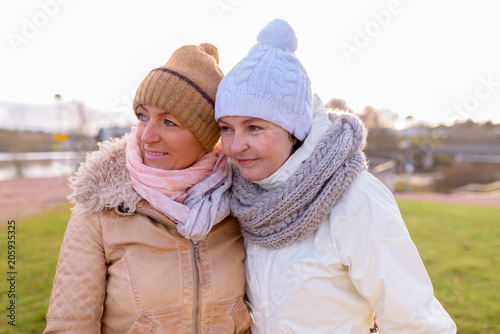 lesbian, couple, love, human relationships, friendship, portrait, people, adult, europa, finland, finnish, nordic, person, scandinavia, scandinavian, together, 2, mature, beautiful, female, woman, woman, attractive, landscape, leisure, nature, outdoors, park, peaceful, relaxation, clothes, clothing, coat, elegant, hat, homosexual, mid, stylish, winter