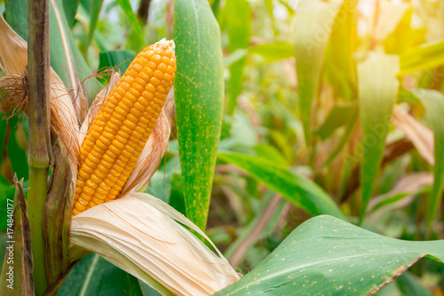 Two mature yellow cob of sweet corn on the field. Collect corn crop.
