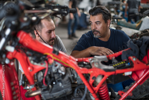 2, mechanic, working, motorcycle, workshop, technology, people, industry, communication, adult, business, man, motorbike, repairing, colleague, motor, vehicle, craft, competence, enduro, looking, occupation, pair, beard, expertise, caucasian, young, advising, talking, mid, discussing, south africa, skill, cooperation, job, male