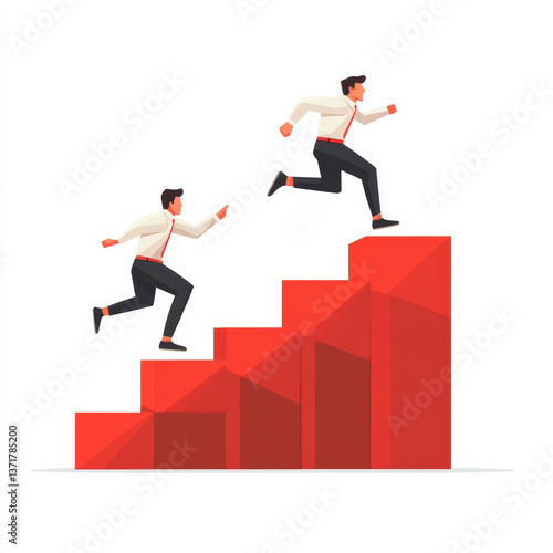 Two men climbing red stairs symbolizing growth and success in business.