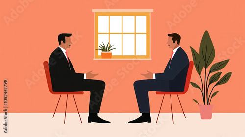 man, suit, conversation, office, modern, chair, plant, window, flat, design, business, discussion, teamwork, professional, indoor, dialogue, 2, sitting, talking, corporate, meeting, workspace, casual attire, expression, interaction, partnership, communication, illustration, collaboration, friendly, environment, colours, creative, art, graphic, character, lifestyle, human relationships, male, attire, interior, decor, furniture, contemporary, engagement, connection, visual, scene, social