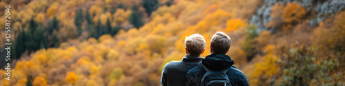 man, back, autumn, fall, foliage, landscape, yellow, orange, tree, wood, forest, sweater, jacket, backpack, blurred, background, nature, scenery, view, observation, couple, two people, hair, blond, grey, dark, hillside, open, space