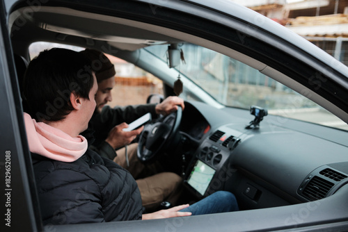 car, man, phone, seat, cabin, auto, driver, passenger, navigation, map, help, search, travel, transport, screen, device, info, road, route, wheel, dashboard, interior, communication, teamwork, plan, support, vehicle, journey, talk, view, action, assistance, decision, moment, friends, ride, trip, check, message, direction, situation, cooperation, sharpened