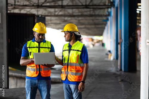 Two men warehouse indian worker wearing safety hardhats helmet working on laptop computer in warehouse of Wholesale Merchandise. shelves, pallets and boxes. Container and warehouse factory
