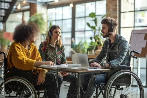 Two mid adult women disagree about the solution to the problem while a man in the wheelchair uses earphones to focus on his work