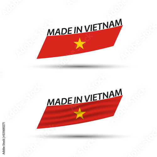 Two modern colored vector Vietnamese flags isolated on white background, Vietnamese flags, Vietnamese ribbon, Made in Vietnam