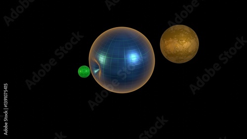 Two moons orbiting liquid planet. Tidal forces. Solid spherical objects gravitational pull influence on liquid sphere. Small balls orbit and deform larger one. 3d render illustration.
