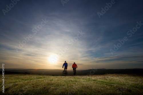 recreation, mountain biking, riding, copy space, front view, full-length, adventure, flexibility, exhilaration, freedom, togetherness, tranquil, excitement, friendship, on the go, nature, mature adult, man, two people, outdoors, speed, sport, travel, mountain bike, balance, landscape, remote, cycling, male, man, bicyclist, mood, calm, human relationships, bicycle, bicycle, leisure