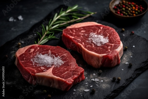 Two mouth-watering pieces of raw steak on a black stone platter, sprinkled with sea salt and garnished with a branch of rosemary. Ai generated