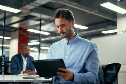 Two multiracial men in businesswear using digital tablet during meeting in office