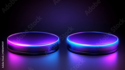 platform, platform, circle, circle, round, neon, light, lighting, dark, background, purple, blue, violet, vibrant, glow, glowing, illuminated, shine, bright, colours, gradient, futuristic, modern, abstract, design, technology, display, product, showcase, presentation, scene, render, three-dimensional, graphic, image, illustration, art, style, aesthetic, sleek, smooth
