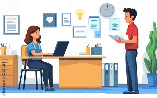 Two office employees during an interview, one sitting at a desk with a laptop and papers, while the other stands across holding documents, in a professional office setting