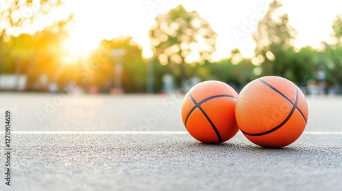 basketball, ball, orange, sport, game, court, playground, summer, sun, light, texture, 2, pair, object, closeup, ground, surface, asphalt, horizon, background, blurred, tree, green, park, evening, golden hour, warm, bright, colourful, active, fun, leisure, healthy, lifestyle, photo, image, picture, photo, sports equipment, playground equipment, sporting goods