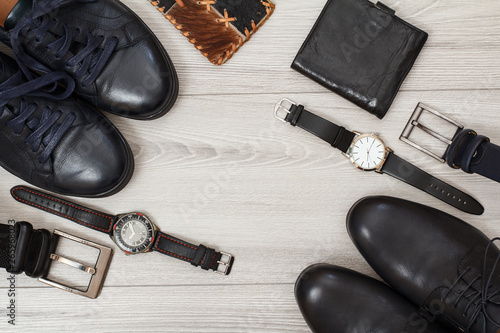 Two pairs of black leather men's shoes, belts for men, wallets and watches on gray background.