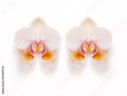 Two pale delicate orchid blossoms face forward on a pristine white background showcasing their intricate orange and pink details.