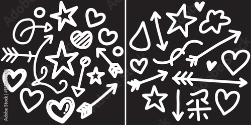 Two panels filled with white hand-drawn doodles on a black background, featuring various hearts, stars, arrows, and abstract swirls.