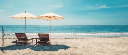 Two parasol umbrellas casting the shadow over the two wooden lounge chairs or easy chairs on an empty sunny sand beach near