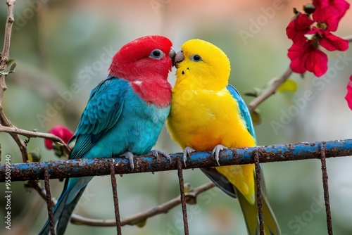 parrot, bird, red, yellow, blue, green, tree branch, rust-eaten, perch, beak, eye, feather, wing, tail, claw, perched, close, up, together, love, romance, affection, nature, animal, wildlife, tropical, exotic, colourful, beauty, outdoors, garden, flora, fauna, background, foliage, closeup, portrait, photo, image, digital, art, graphic, photo, picture, visual, illustration