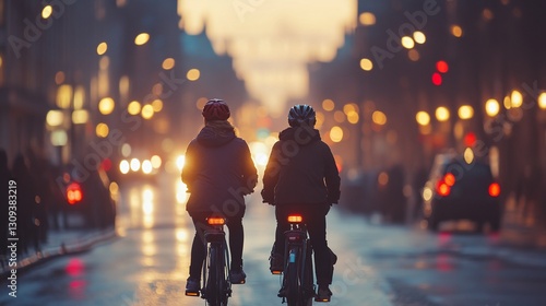 two people cycling on a bicycle during evening commute through crowded city street eco transport lifestyle urban traffic daily motion and modern activity concept