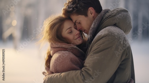 smiling, couple, embracing, snowflake, around, love, winter, romance, happiness, joy, affection, cosy, snowy, weather, cold, cuddle, human relationships, together