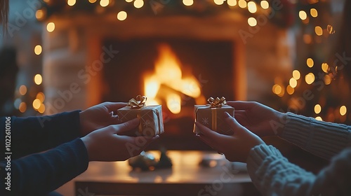 Two people exchanging small wrapped gifts while holding cups of hot cocoa, cozy living room with a glowing fireplace and Christmas decorations, joyful smiles and laughter, soft evening light,