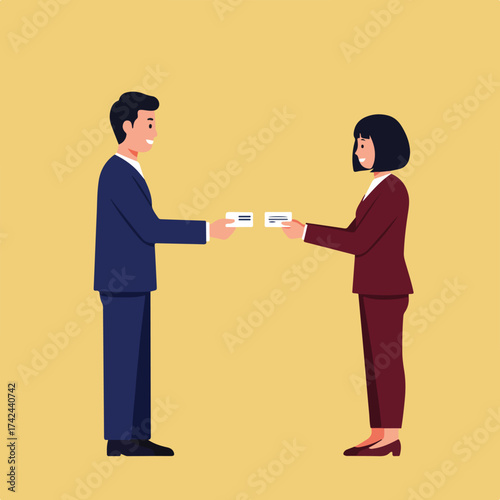 handshake, business, card, exchange, man, woman, suit, professional, meeting, contact, introduction, networking, corporate, people, communication, connection, formal, information, detail, identity, giving, receiving, modern, flat, graphic, illustration, design, simple, clean, friendly, courtesy