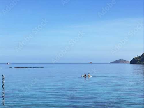 Two people kayaking on calm tropical waters near Labuan Bajo in the morning, exploring scenic islands of Indonesia