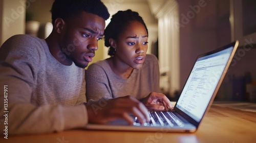 technology, computer, laptop, screen, couple, face, expression, worry, concern, work, home, indoor, lighting, desk, table, hand, finger, typing, software, code, datum, information, communication, cyberspace, online, browsing, searching, problem, issue, difficulty, stressful, late, evening, night, dark, background, casual attire, clothes, serious, focused, observing, watching, young, adult, people, together, collaboration
