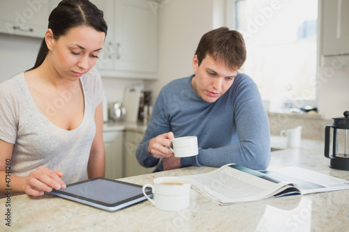 30s, man, male, caucasian, 20s, young adult, woman, female, indoor, looking down, friendship, kitchen, table, worktop, drinking, holding, cup, mug, beverage, hot drink, couple, human relationships, boyfriend, girlfriend, together, wife, husband, lunch break, corporate, sitting, office, concentrated, earnest, calm, thoughtful, serious, focused, reading, cover, page, paper, curious, home, house, department, touch screen, scrolling