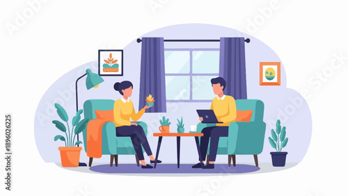 home, interior, furniture, living, room, relaxing, sitting, couch, armchair, 2, people, man, woman, laptop, computer, technology, device, online, work, leisure, casual attire, indoor, domestic, cosy, comfortable, plant, potted, green, nature, decor, artwork, picture, window, curtain, lamp, light, table, hot drink, mug, cup, modern, illustration, flat, design, lifestyle, partnership, connection, discussion