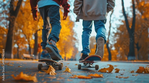 Two people ride skateboards on a urban street, casual scene